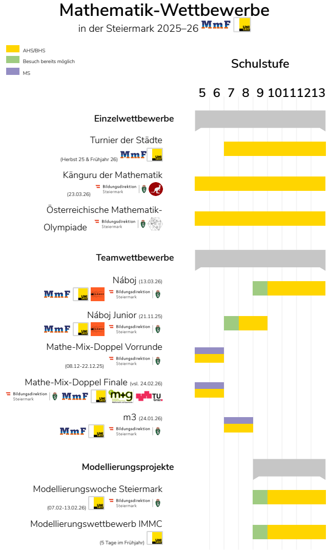 • Mathe-Mix-Doppel – Schulinterne Vorrunde in gemischten 2er-Teams, Finale an der Universität; spannende Partnerarbeit für alle.